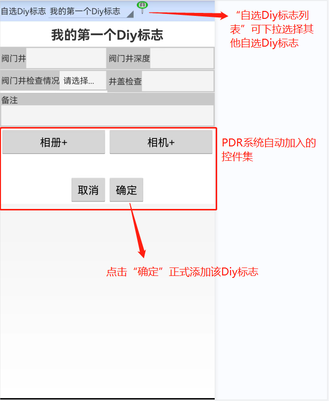 本窗口正中间的灰色区域为Diy标志的最终显示效果,同时PDR会自动在所有Diy标志的底部加入相册相机按钮、照片显示控件,还会加上确定、取消按钮。