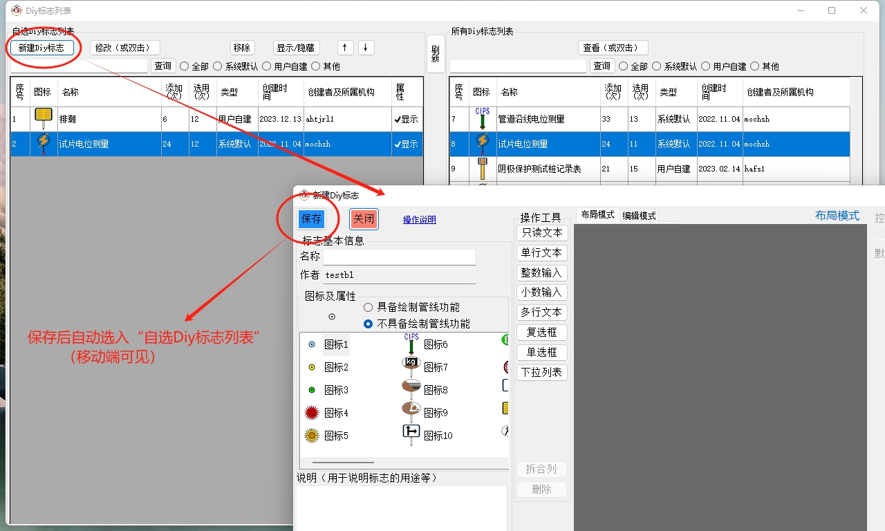 本窗口专用于设计Diy标志。设计并保存后,通过PDR移动端的“自定”按钮可以选择到该标志,并添加到项目中。