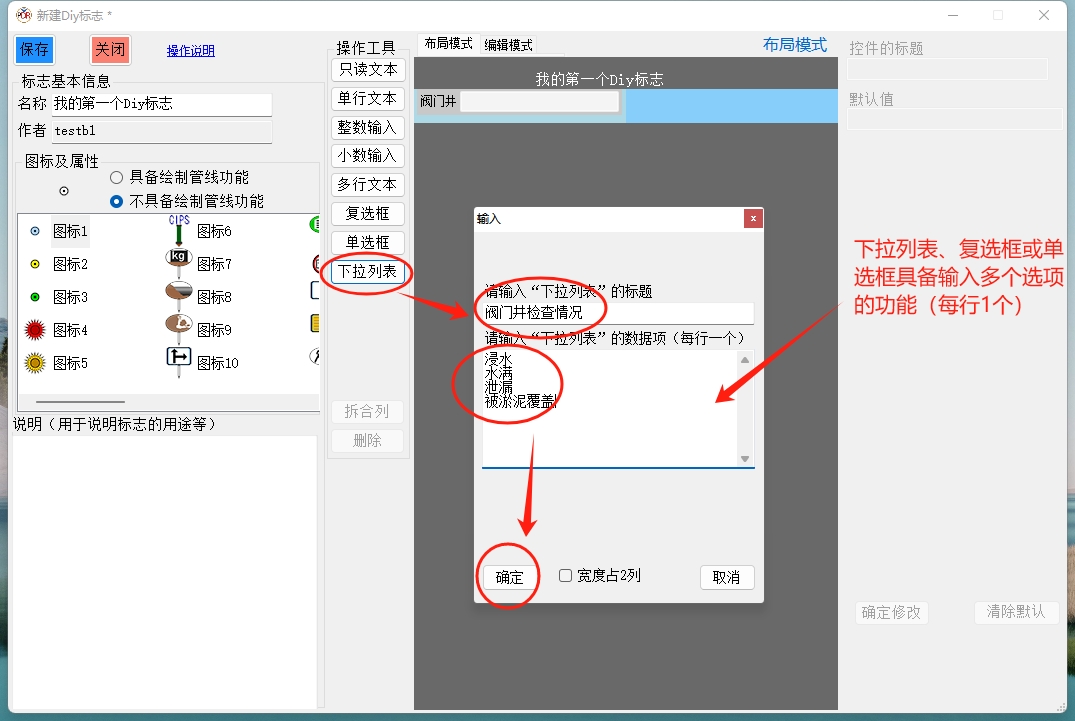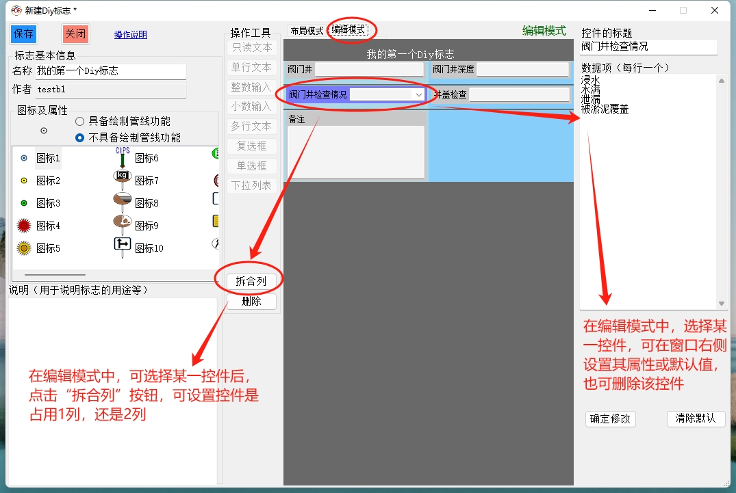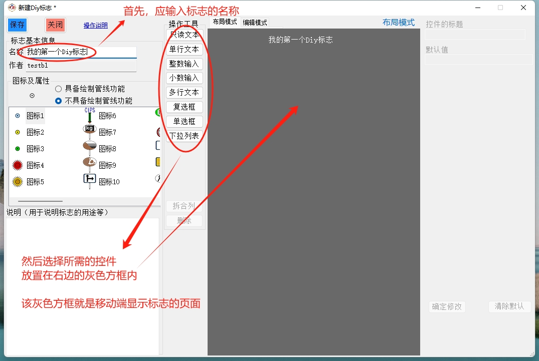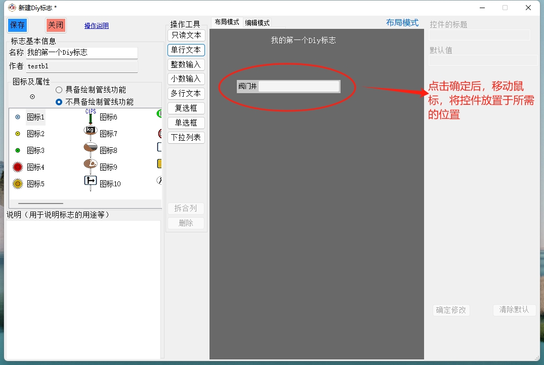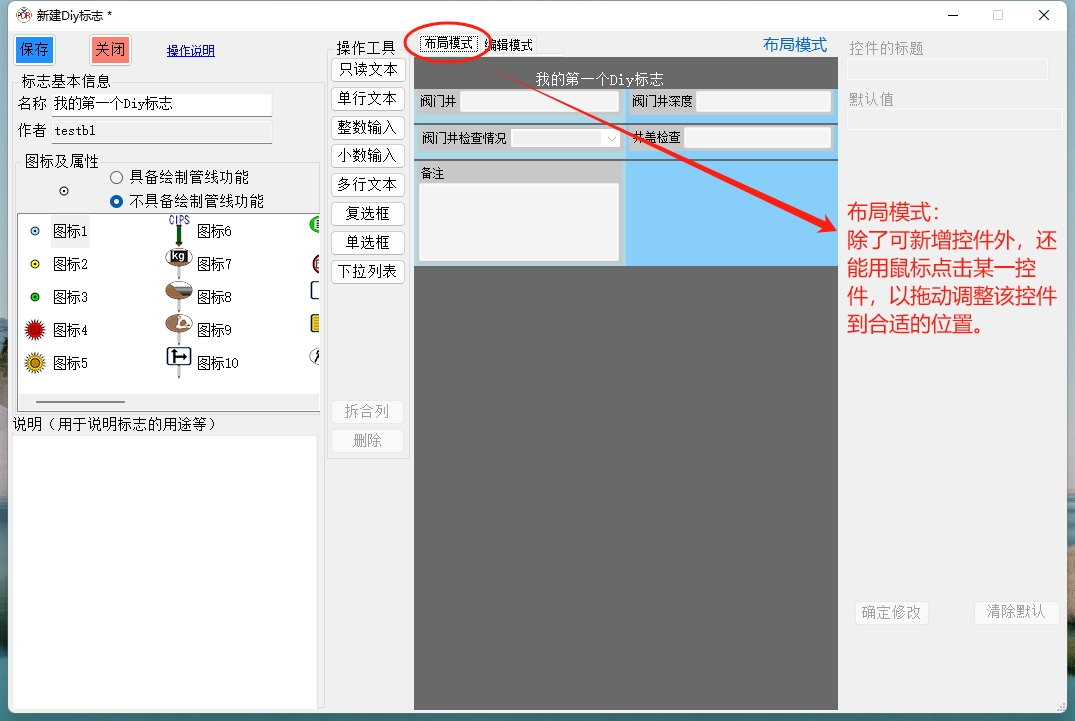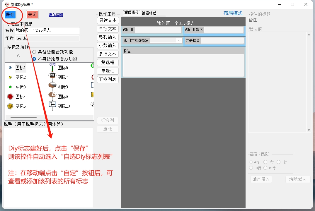 本窗口最左侧为Diy标志的名称、所使用图标以及标志的说明等基本信息的设置;其中应特别注意图标的属性是选择“具备绘制关系功能”,还是“不具备绘制管线功能”(默认)。