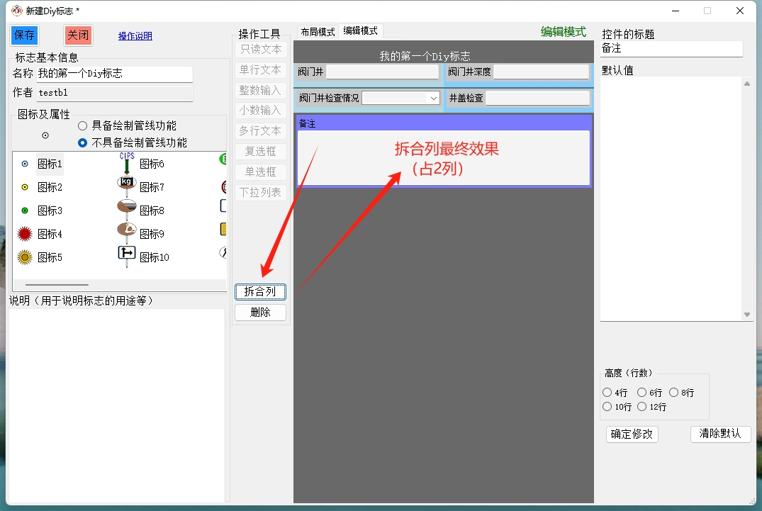 点击灰色区域顶部的“编辑模式”标签可切换到编辑模式。在编辑模式下,点击灰色区域内的某一控件,可在窗口右侧设置其属性或默认值,也可删除该控件;也可选择某一控件后,再点击“拆合列”按钮,设置该控件是占用1列,还是2列。